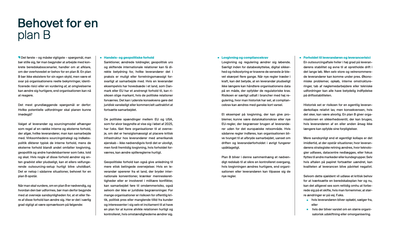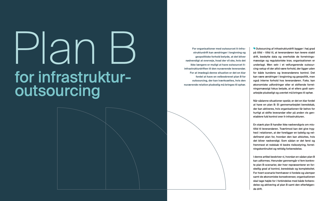 En veldefineret plan B for infrastruktur-outsourcing er et centralt redskab til risikostyring og forretningskontinuitet. Den giver et klart overblik over handlemuligheder, omkostninger og konsekvenser, hvis outsourcing-aftalen skal ophøre med kort varsel, eller hvis der opstår behov for at genetablere kontrol over it-infrastrukturen.