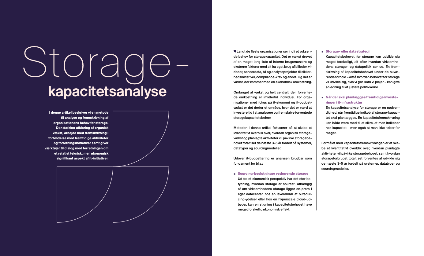 Stigende datamængder og voksende storageomkostninger gør kapacitetsplanlægning til et centralt it-økonomisk tema. Artiklen præsenterer en metode til analyse og fremskrivning af storagebehov 3–5 år frem og viser, hvordan denne kan omsættes til et solidt beslutningsgrundlag for budgettering, sourcing og infrastrukturinvesteringer.